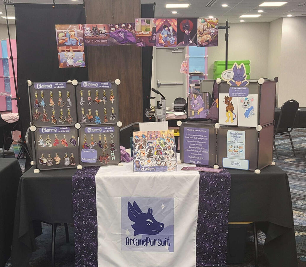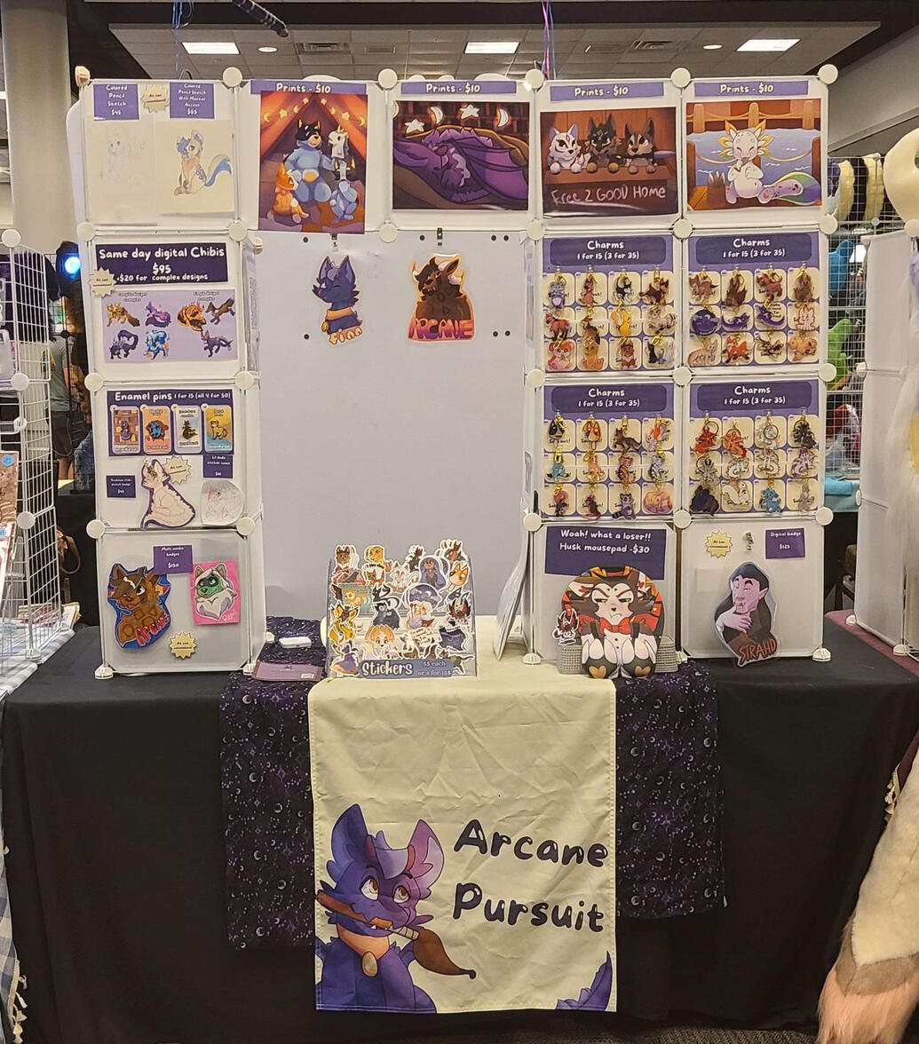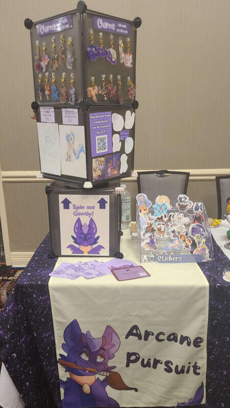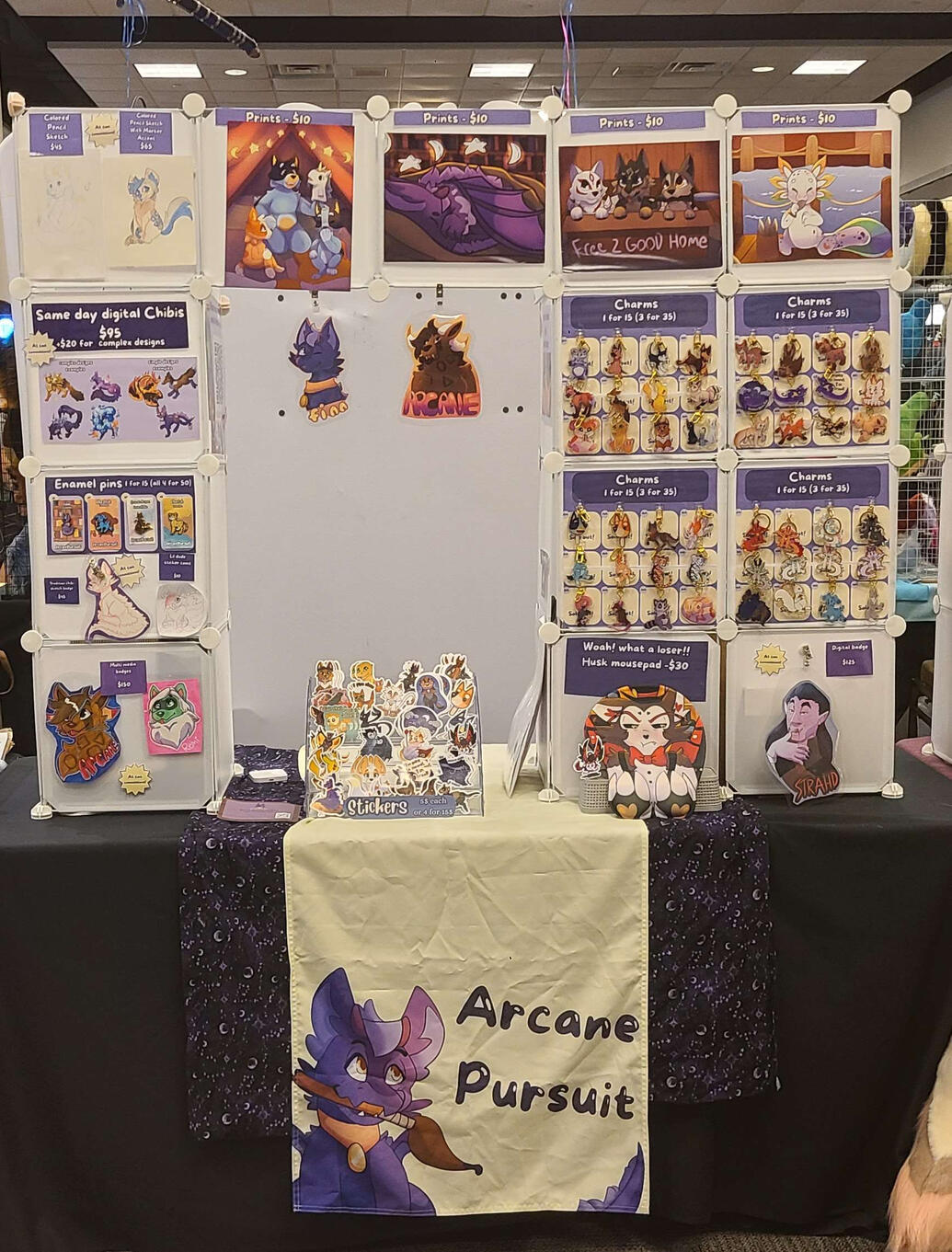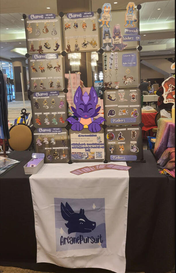 Howdy, I'm ArcanePursuit. I am an furry merch creator and artist based out of Fort Worth, Texas. I joined the furry fandom in 2017, and have been doing conventions starting in 2023, where I dived right into the deep end with vending at the Texas Furry Fiesta Artist Alley. That experience really made me fall in love with vending at furry conventions and I've been here ever since.My specialty is all things cute and adorable. My most popular items are my keychains, stickers and enamel pins. I do custom art commissions as well.